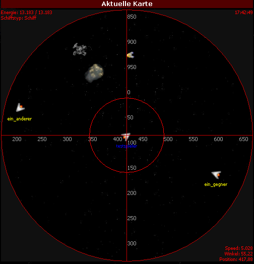 So könnte ein kurzer Ausschnitt in der animierten Sternenkarte aussehen. In dem kleinen Video (2,87 MB, bitte auf die Grafik klicken) birgt der Spieler zunächst einen Asteroiden und eine Rettungskapsel und greift anschließend einen Gegner an (auf das Durchsuchen des Schiffswracks wird hier verzichtet).